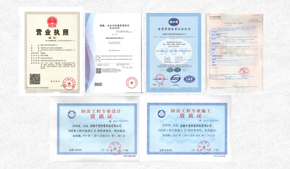 公司使用的產(chǎn)品均通過(guò)了北京雷電防護(hù)裝置測(cè)試中心等國(guó)家權(quán)威性檢測(cè)機(jī)構(gòu)檢測(cè),具有CE、CCC等相關(guān)認(rèn)證,以過(guò)硬的工程質(zhì)量獲得了中國(guó)人保的工程質(zhì)量承保。