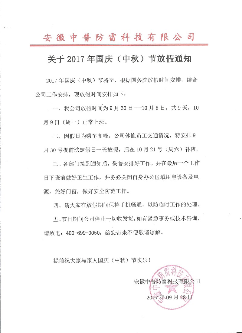 關(guān)于2017年國(guó)慶(中秋)節(jié)放假通知